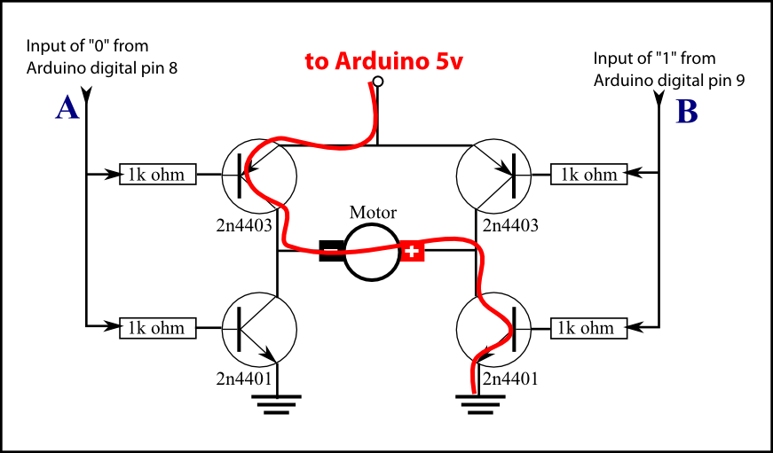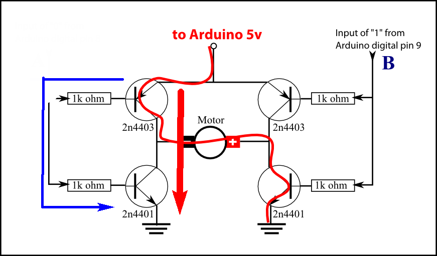 Собрал H-мост по схеме ниже, даже работает. Если подтянуть вход a к плюсу, вход b к земле, то мотор крутится в одно сторону. Если подтянуть вход b к плюсу, вход a к земле, то мотор крутится в другую сторону. Проблема в том, что если не подтягивать входы a и b, то транзисторы нагреваются до 65 градусов за пару секунд. Как можно этого не допустить? PNP: http://www.mouser.com/ds/2/149/KSA928A-59269.pdf NPN: http://www.mouser.com/ds/2/149/KSC2328A-57615.pdf