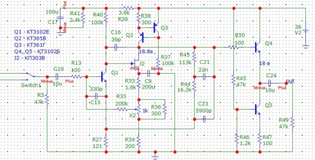 Господа! Нужная тема, но почему то заглохла. А ведь много есть что еще сказать. Как то я в теме" Расчет цепи коррекции RIAA", упоминал про винил корректор от легендарного усилителя Бриг-001. Покрутил его в Micro-Cap и он показал хороший результат. И вот я решил его попробовать в железе. Но выход у него высокоомный и пока думал как сделать, случайно на ютубе увидел картинку, уже готовое решение и именно для этого корректора. Сколько потом искал, не нашел и автора, на кого бы сослаться не нашел. Может потом найду. Этот автор присоединил к этому корректору эммитерный повторитель с динамической нагрузкой, вот я его и повторил. Настройка очень простая, резистором 1ком установить на выходе половину напряжения питания. Корректор выдал очень хороший звук, я бы сказал, очень хороший. Я специально поставил все транзисторы советские, подобрал только по коэффициенту усиления и не ошибся. Вышло так, что на данный момент у меня это основной корректор, теперь я с ним другие сравниваю. Выходит что и в семидесятых наши инженеры чего то стоили ( Лихницкий, Ратаев) , раз их корректор , их схемное решение и через 50 лет работает, да еще как.