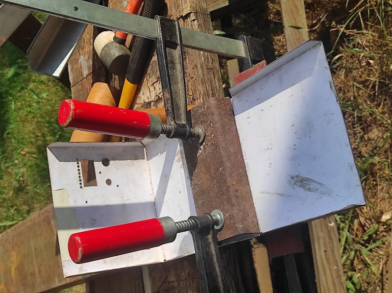 Со стороны малого фланца вырезал квадрат для извлечения через него зелёного горошка (После него очень легко отмыть банку.) и последующего запихивания вместо него внутренностей регулятора, в образовавшихся секторах шилом проделал дырки под шурупы, а крышку изготовил из большого фланца от такой же банки. Получилось вполне крепко и помехозащищённо (эти тиристоры так любят создавать помехи...).