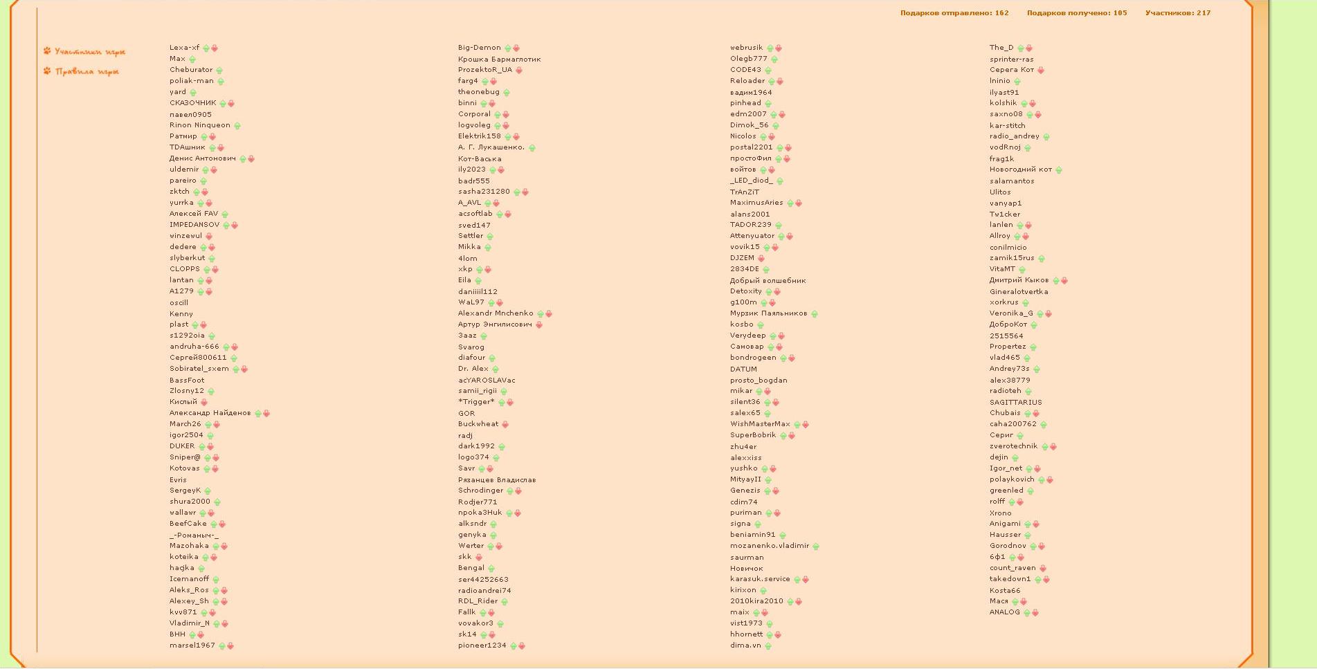Отправлено 162 Получено 105 Подозрительно большая разница, возможно кто-то ничего и не слал вовсе? Не верится что 35% посылок потерялось. Надеюсь в этом году будет больше честных участников игры